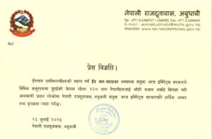 युएईले इस्लाम धर्मावलम्बीहरूको महान् पर्व ईद अल-अदाहको अवसरमा जेलमा रहेका १२० जना नेपालीलाई आममाफी दिएको हो।