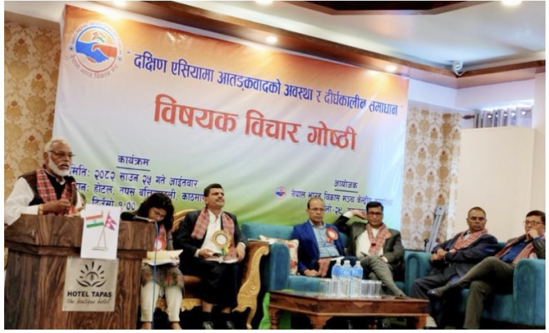 काठमाडौ, साउन २६ गते । नेपाल भारत विकास मञ्चद्वारा राजधानीमा आयोजित “दक्षिण एसियामा आतंकवादको अवस्था र दीर्घकालीन समाधान” विषयक विचारगोष्ठीमा सहभागी वक्ताहरूले आतंकवादलाई मानव सभ्यताको साझा चुनौती र मानवताविरुद्धको अपराधका रूपमा परिभाषित गर्दै यसको समाधानका लागि क्षेत्रीय सहकार्य, राजनीतिक प्रतिबद्धता र नेतृत्वकारी पहल अपरिहार्य रहेको निष्कर्ष निकालेका छन् ।