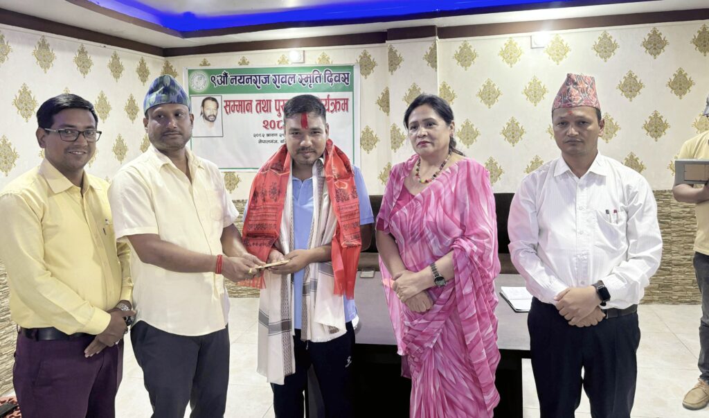 नेपालगन्ज, २९ साउन २०८२ – नेपालगन्जका पत्रकार रामबहादुर ओली (रामु) लाई बिहीबार ‘नयनराज रावल स्मृति पुरस्कार तथा सम्मान’ प्रदान गरिएको छ। लागुऔषध दुरुपयोगविरुद्ध र सामाजिक पुनःस्थापनका पक्षमा कलम चलाएबापत उनलाई यो सम्मान दिइएको हो।