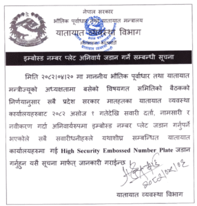 सूचनामा विभागले भनेको छ, “सबै सवारीधनीहरूले यथाशीघ्र सम्बन्धित यातायात कार्यालयमा गई High Security Embossed Number Plate जडान गर्नु हुन यो सूचना मार्फत जानकारी गराइन्छ।”