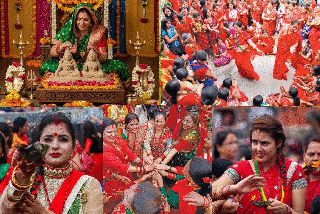 महिलाहरूले निर्जला व्रत राख्छन् र दिनभर भगवान शिव र पार्वतीको पूजा गर्छन्।