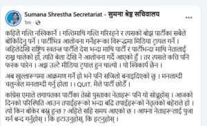 उनले त्यहाँ लेखेकी छन्,‘अब खुल्लारूपमा आक्रमण गर्ने हो भने पनि सजिलो बनाइदिएको छु। मनलाग्दी चलुन्जेल मनलाग्दी गर्नुहोला। मैले पार्टी छाडेँ।’