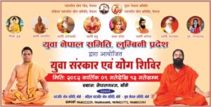 नेपालगञ्ज, बाँके – युवा नेपाल समिति, लुम्बिनी प्रदेशको आयोजनामा मिति २०८२ कार्तिक ९ गतेदेखि १३ गतेसम्म नेपालगञ्जको रामलीला मैदान नजिक पाँचदिने निःशुल्क आवासीय ‘युवा संस्कार एवं योग शिविर’ सञ्चालन हुने भएको छ। यो शिविर पूर्णतः निःशुल्क रहेको र १५ देखि ३० वर्ष उमेर समूहका युवा, विद्यार्थी तथा शिक्षकहरूलाई लक्षित गरिएको आयोजकले जनाएको छ।