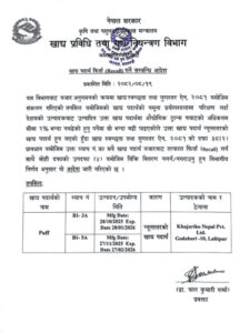 काठमाडौँ । खाद्य प्रविधि तथा गुणस्तर नियन्त्रण विभागले ललितपुरको खजुरीको नेपाल प्रा.लि.ले उत्पादन गरेका दुई फरक ब्याचका ‘पफ’मा हानिकारक ट्रान्स फ्याट दुई प्रतिशतभन्दा बढी भेटिएपछि ती उत्पादन तत्काल बजारबाट फिर्ता गर्न आदेश जारी गरेको छ।