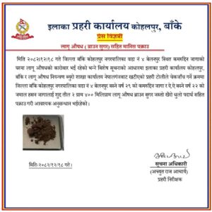 प्रहरी टोलीमा लागू औषध नियन्त्रण ब्यूरो शाखा कार्यालय नेपालगन्ज समेत सहभागी रहेको थियो।