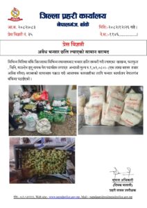 जिल्ला प्रहरी कार्यालय नेपालगञ्जका सूचना अधिकारी (प्रहरी नायब उपरीक्षक) दिपक पातलीले हस्ताक्षर गरेको विज्ञप्तिमा भन्सार छली नियन्त्रण र अवैध तस्करी रोक्न प्रहरीले निरन्तर अनुगमन र कारबाही गरिरहेको उल्लेख छ।